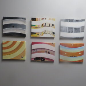 The focus of each panel is a person or people enjoying abstract art from the famous circular balconies of the New York City museum whose architect was the then radical architect Frank Lloyd Wright.