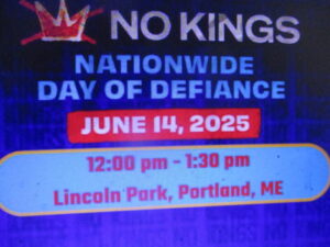 You are urged to attend the NO KINGS NATIONWIDE DAY OF DEFIANCE on Flag Day, June 14th. The rally will take place at Lincoln Park from 12 noon to 1:30 pm, in Portland.